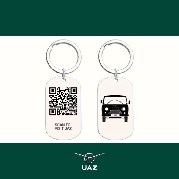 Sleutelhanger rechthoekig UAZ SGR met QR code uit RVS. Met deze sleutelhanger heb je altijd direct de website voor het bestellen van UAZ onderdelen bij de hand, scan gewoon de QR code op de sleutelhanger met je camera.