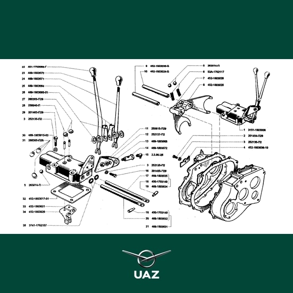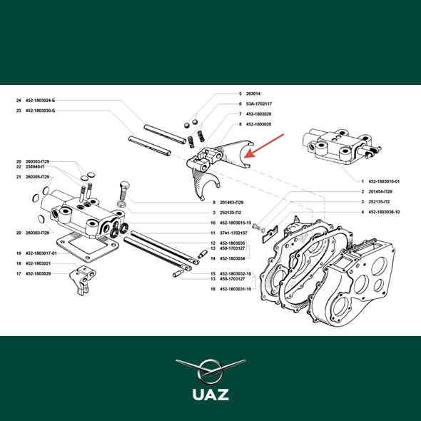Schakelvork voor de tussenbak voor het inschakelen van de reductieversnelling. Geschikt voor alle uitvoeringen van de UAZ 452 en de UAZ 469 modellenreeks met UAZ tussenbak met rechte tanding.
