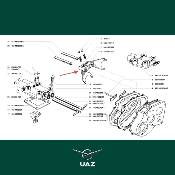 Schakelvork voor de tussenbak voor het inschakelen van de vooras. Geschikt voor alle uitvoeringen van de UAZ 452 en de UAZ 469 modellenreeks met UAZ tussenbak met rechte tanding.