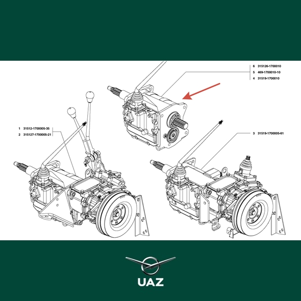 Volledig gesynchroniseerde versnellingsbak met 4 versnellingen nieuwe type. Geschikt voor alle uitvoeringen van de UAZ 3151 modellenreeks met UMZ-4178 of 4218 motor.
