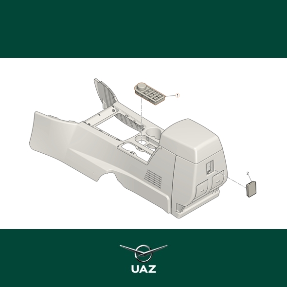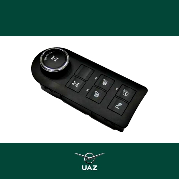 Bedieningsmodule middenconsole met schakelaars voor sper, verwarmde stoelen, verwarmd stuurwiel en parkeersensoren. Geschikt voor alle uitvoeringen van de UAZ Patriot en de UAZ Pickup modellenreeks met bouwjaar vanaf 2017.
