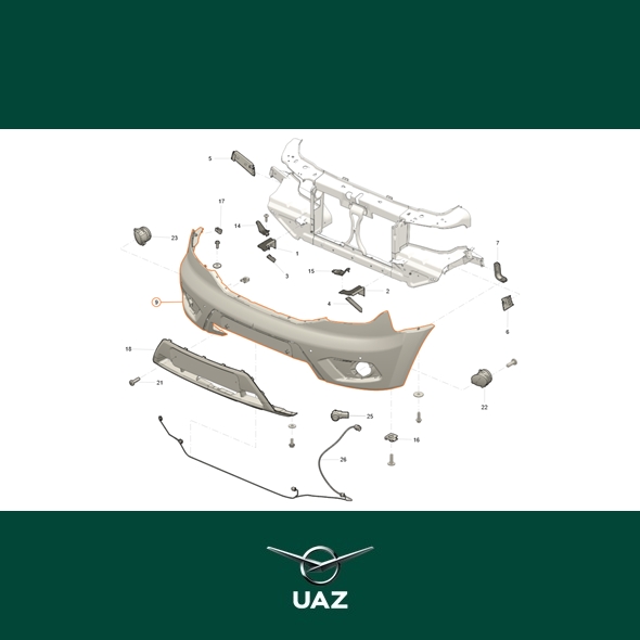 Voorbumper met voorbereiding voor parkeersensoren. Geschikt voor alle uitvoeringen van de UAZ Patriot en de UAZ Pickup modellenreeks met bouwjaar vanaf 2014.