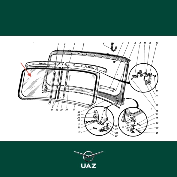 Voorruit rechter deel groen getint. Geschikt voor alle uitvoeringen van de UAZ 469 modellenreeks met gedeelde voorruit.