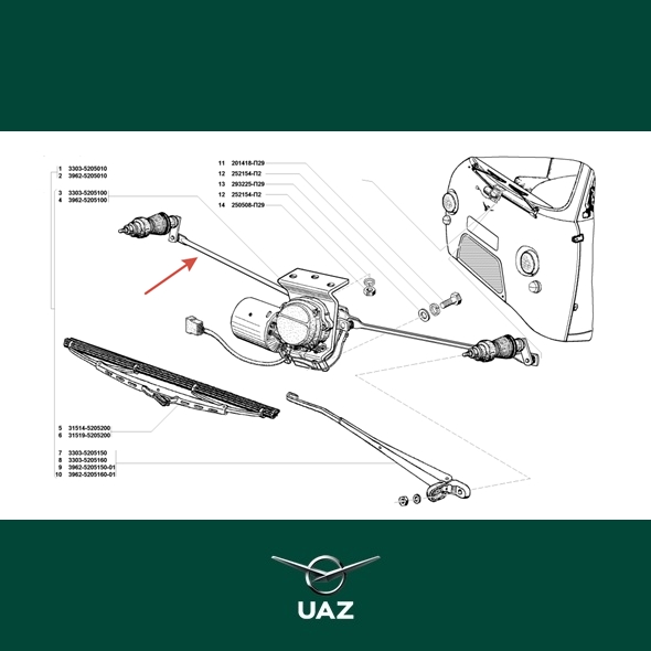 Ruitenwissermechanisme voor de voorruit. Geschikt voor alle uitvoeringen van de UAZ 452 modellenreeks.