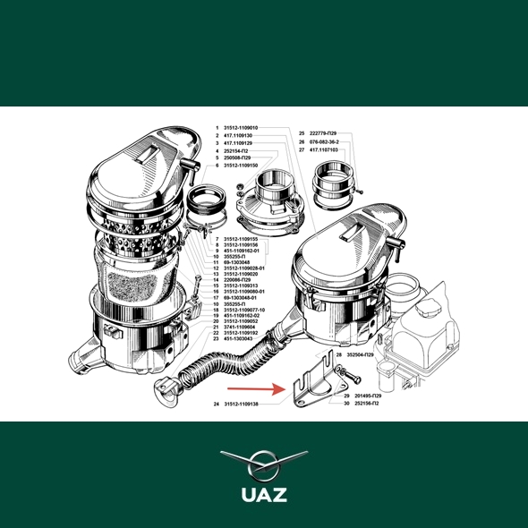 Montagebeugel voor de behuizing van de luchtfilter.  Geschikt voor alle uitvoeringen van de UAZ 452 en de UAZ 469 modellenreeks met UMZ-4178 of 4218 motor.