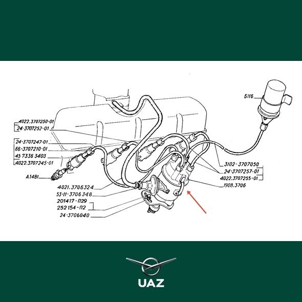 Stroomverdeler. Geschikt voor alle uitvoeringen van de UAZ 452 en de UAZ 469 modellenreeks met ZMZ-402 motor en carburateur.